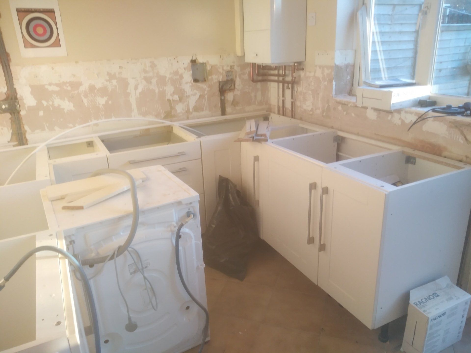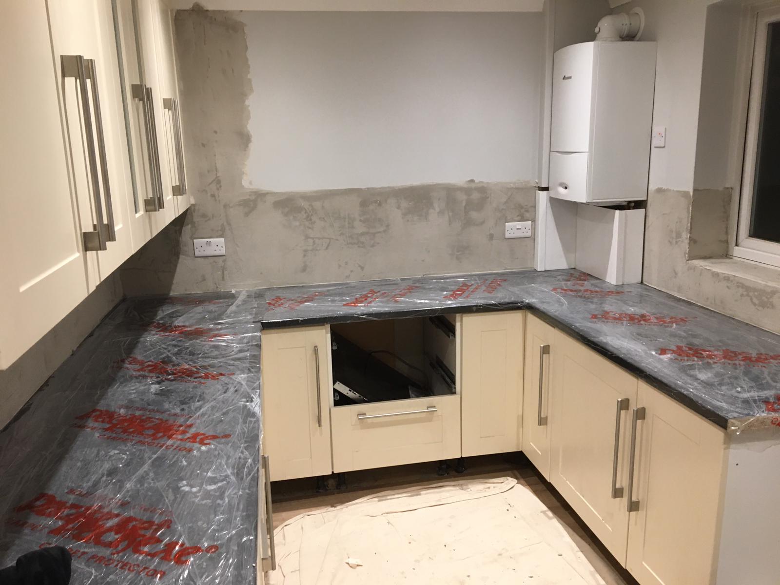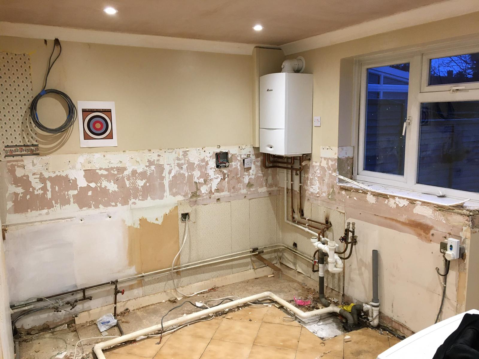 New pipework was fitted to accommodate the new layout, existing boiler and external tap. Once this was done the kitchen units were fitted.