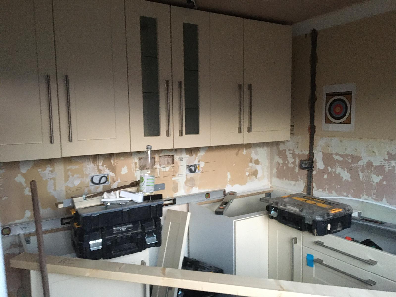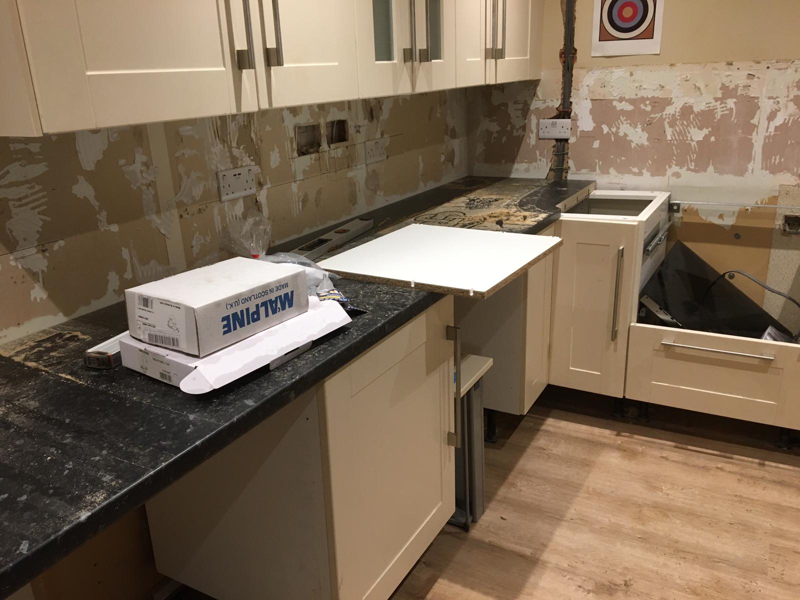Due to an issue with the worktops we had to pause work while new ones were sourced. This allowed the new Karden floor to be fitted and the walls to be decorated by others.