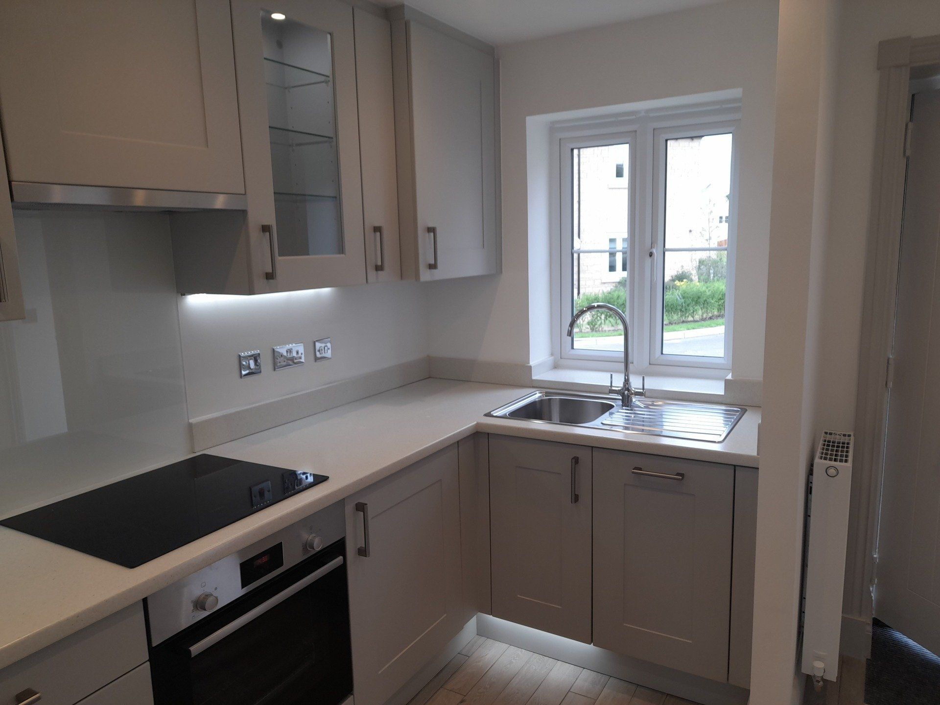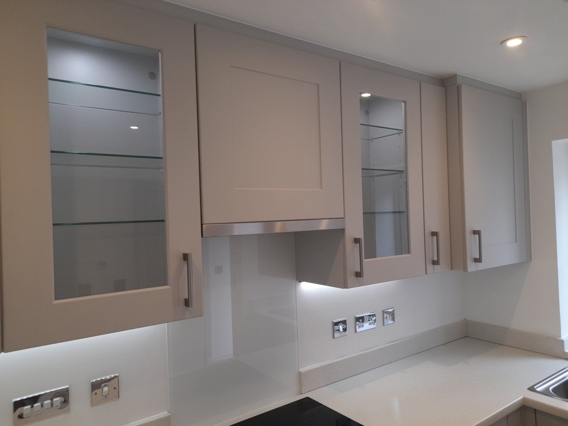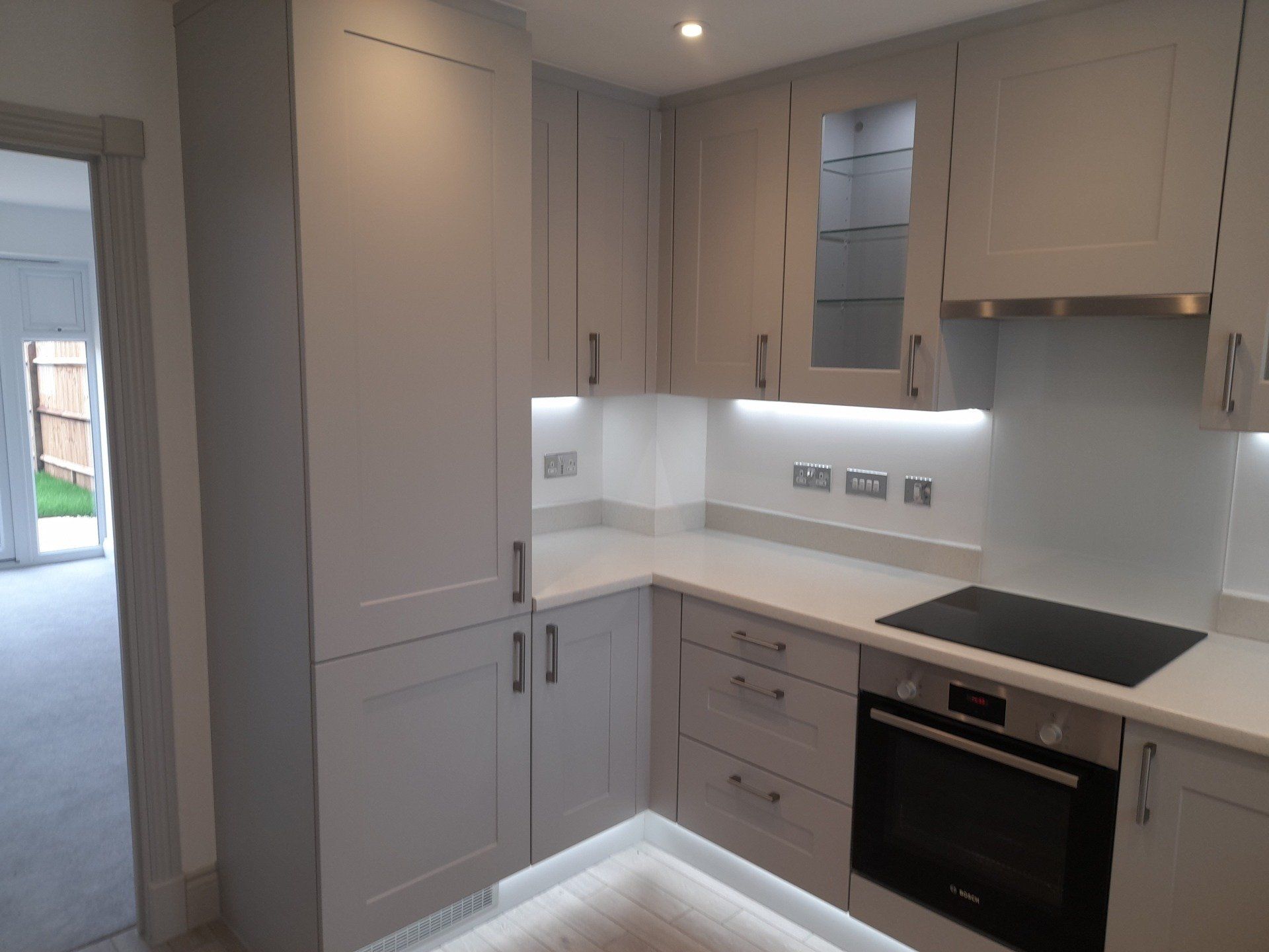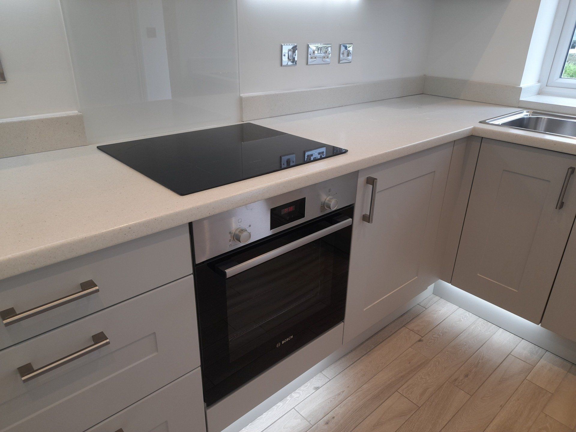 Bosch appliances, glass splashback, Blanco sink and tap with laminate worktops and upstands
