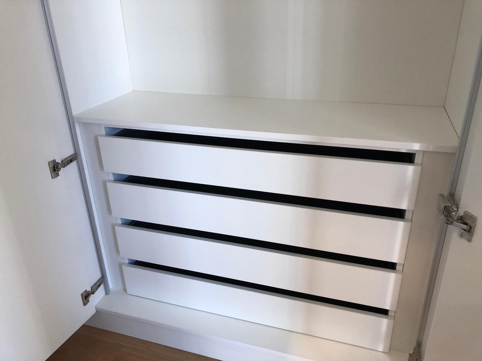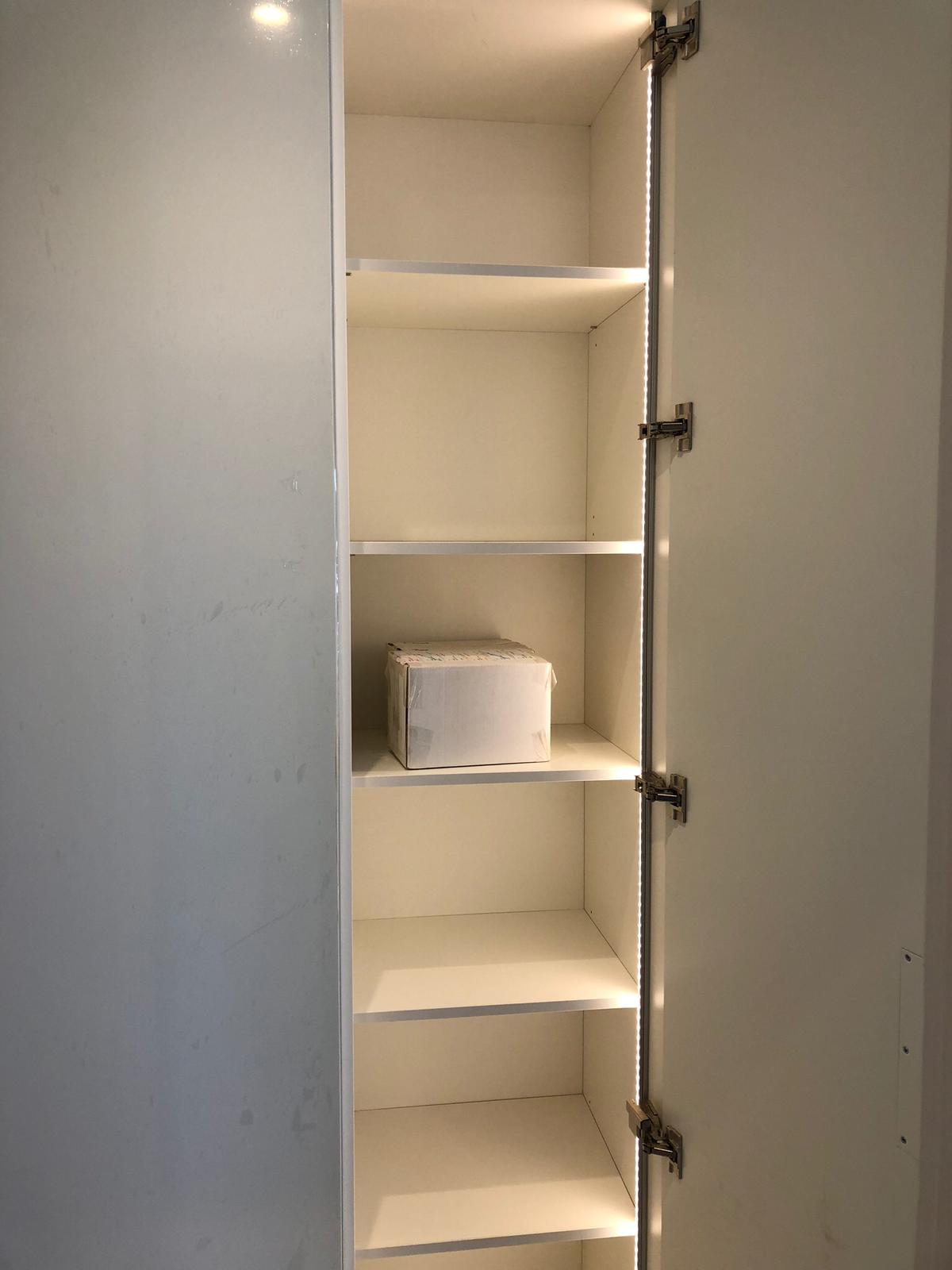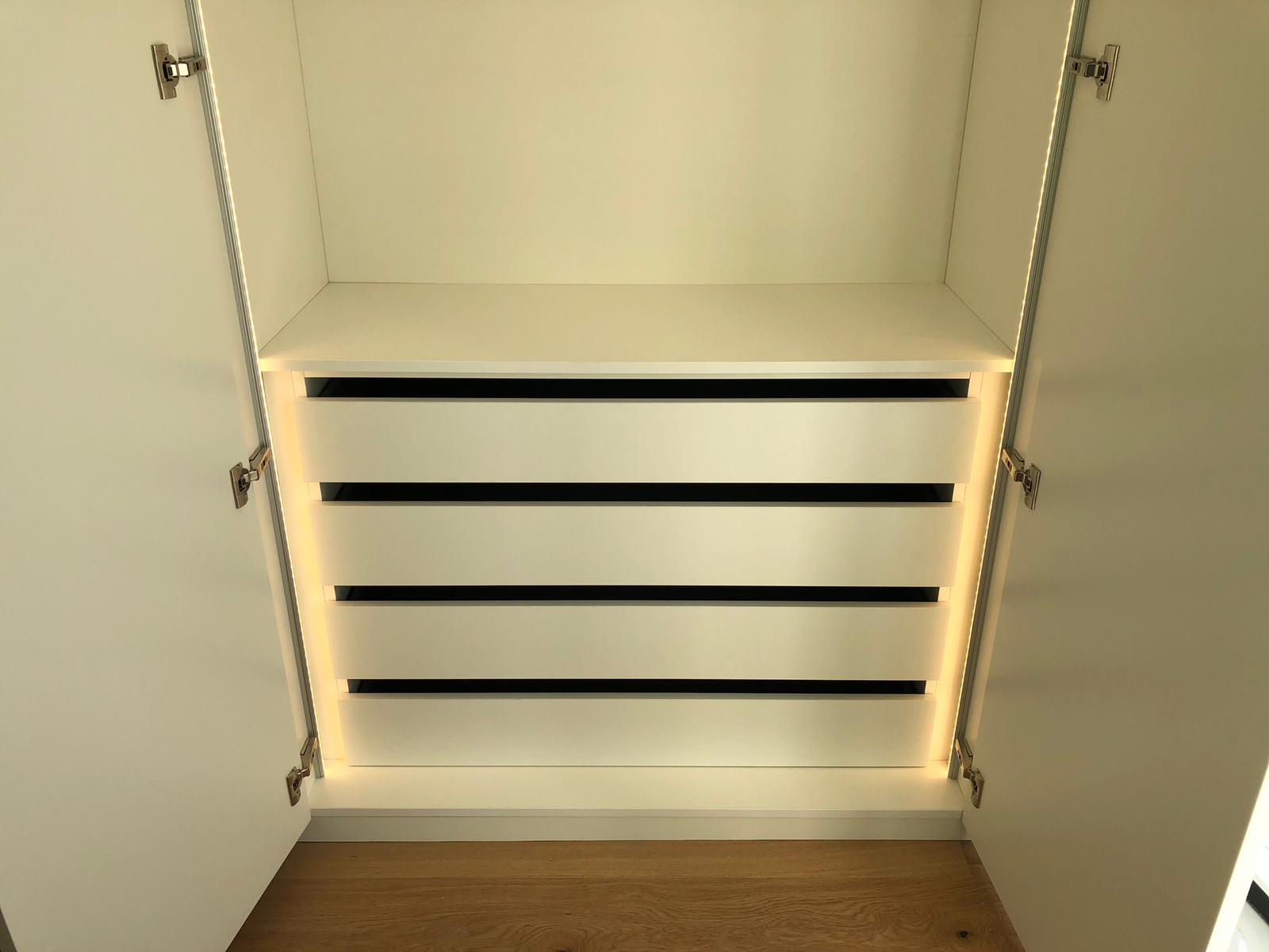 Bespoke English hand sprayed wardrobe with drawers. Built in handle door. One of 8 sets fitted in four new build houses. Lighting is on sensors and comes on only when the door is opened.