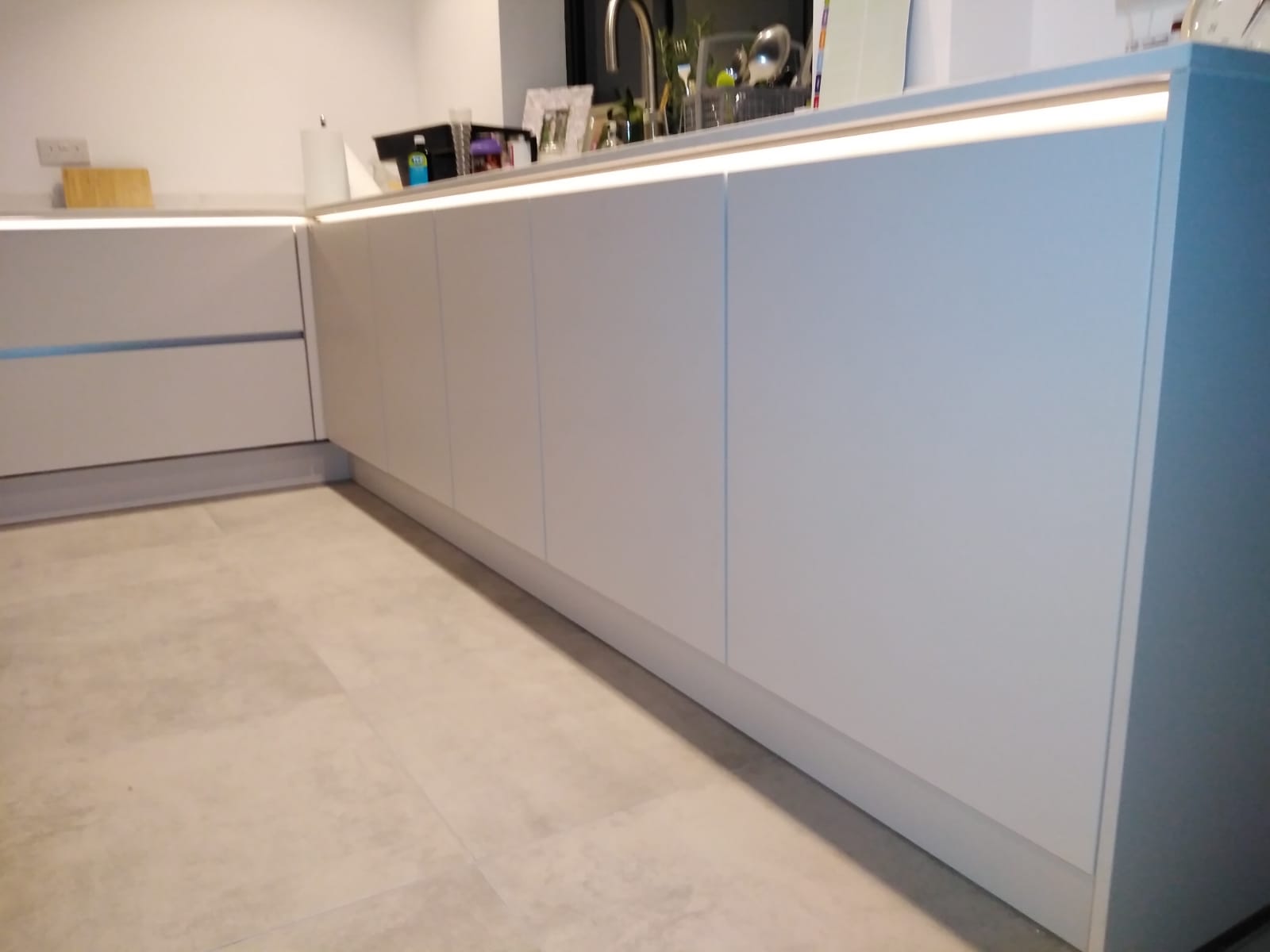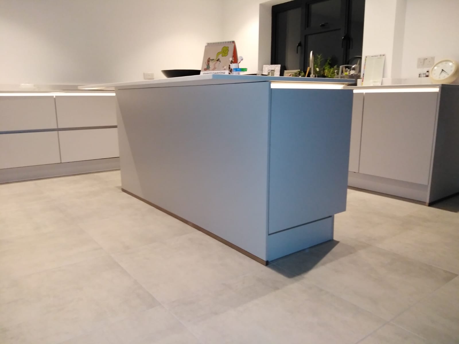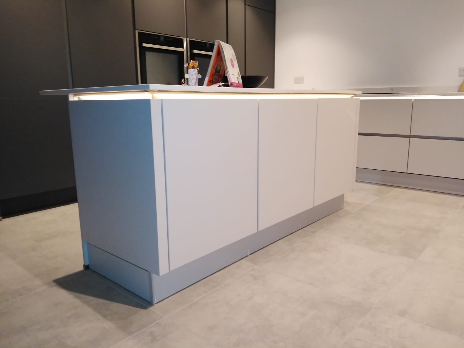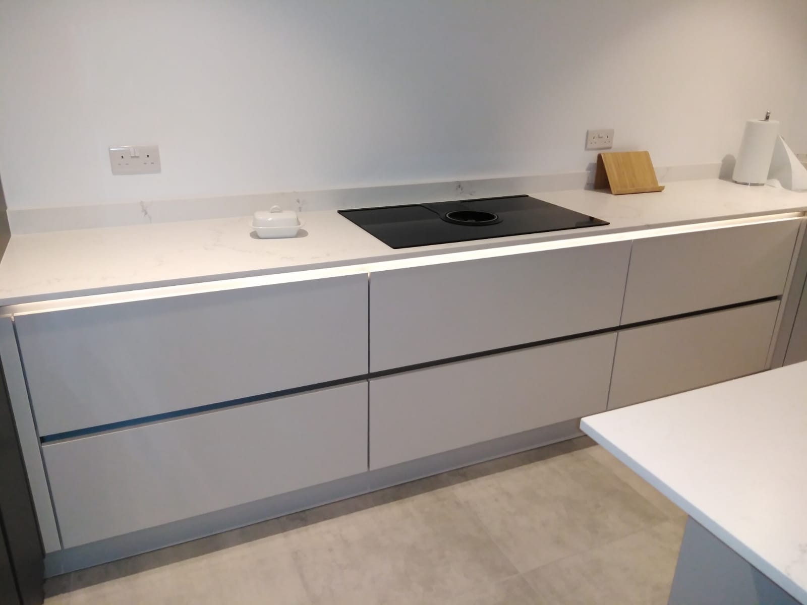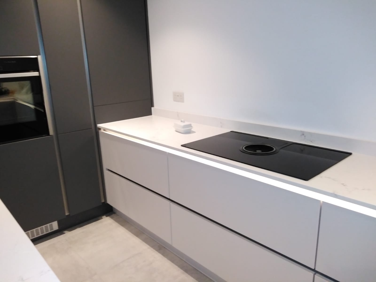 Bespoke two tone German kitchen with Siemens ovens, Elica downdraft induction hob and emotion lighting
