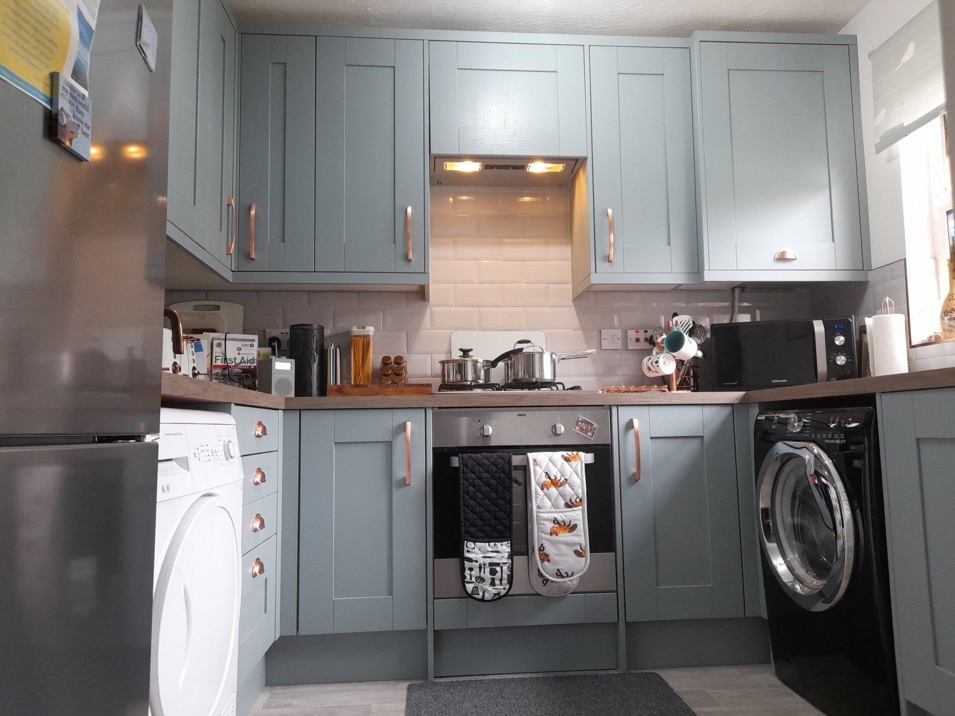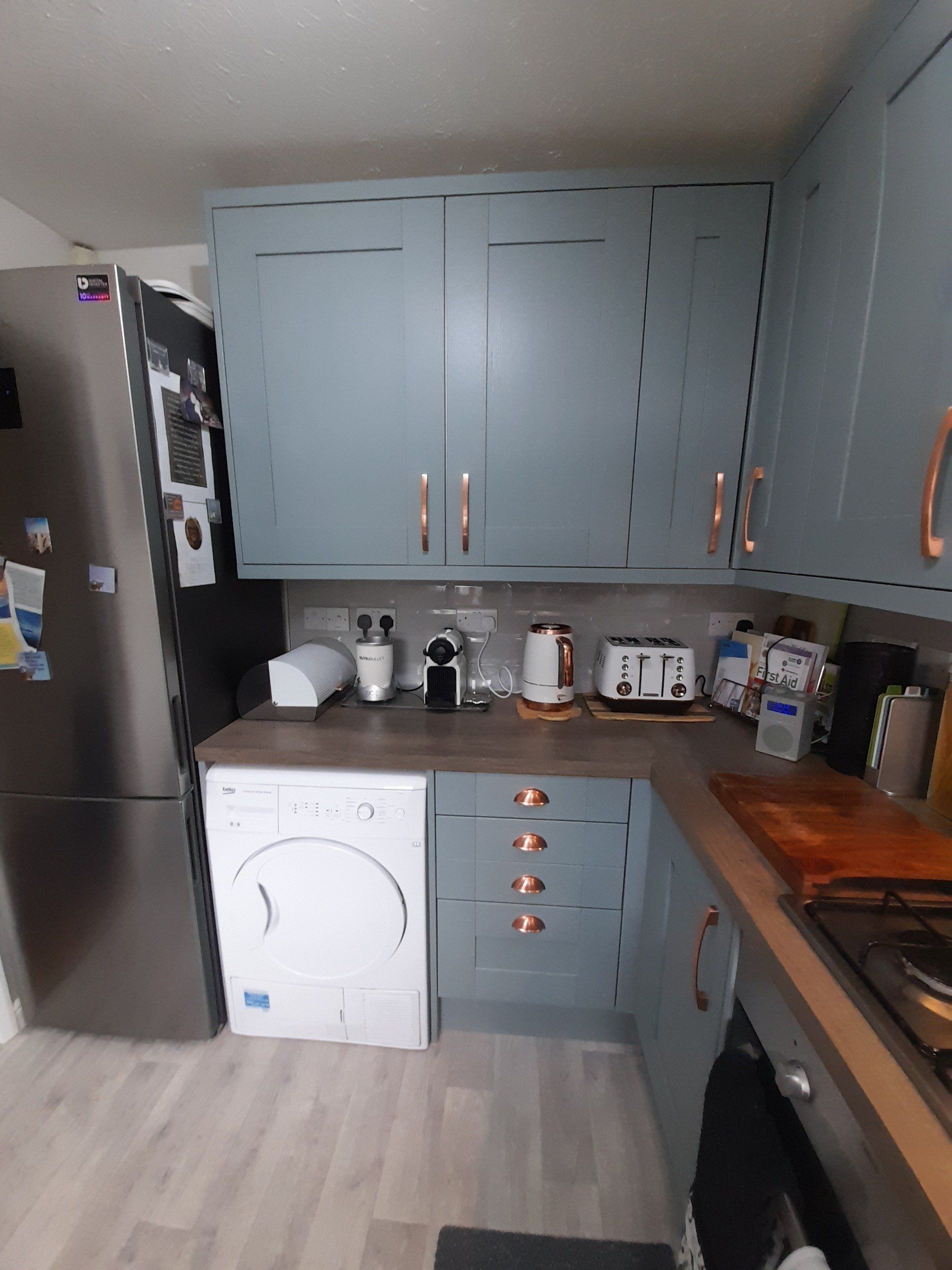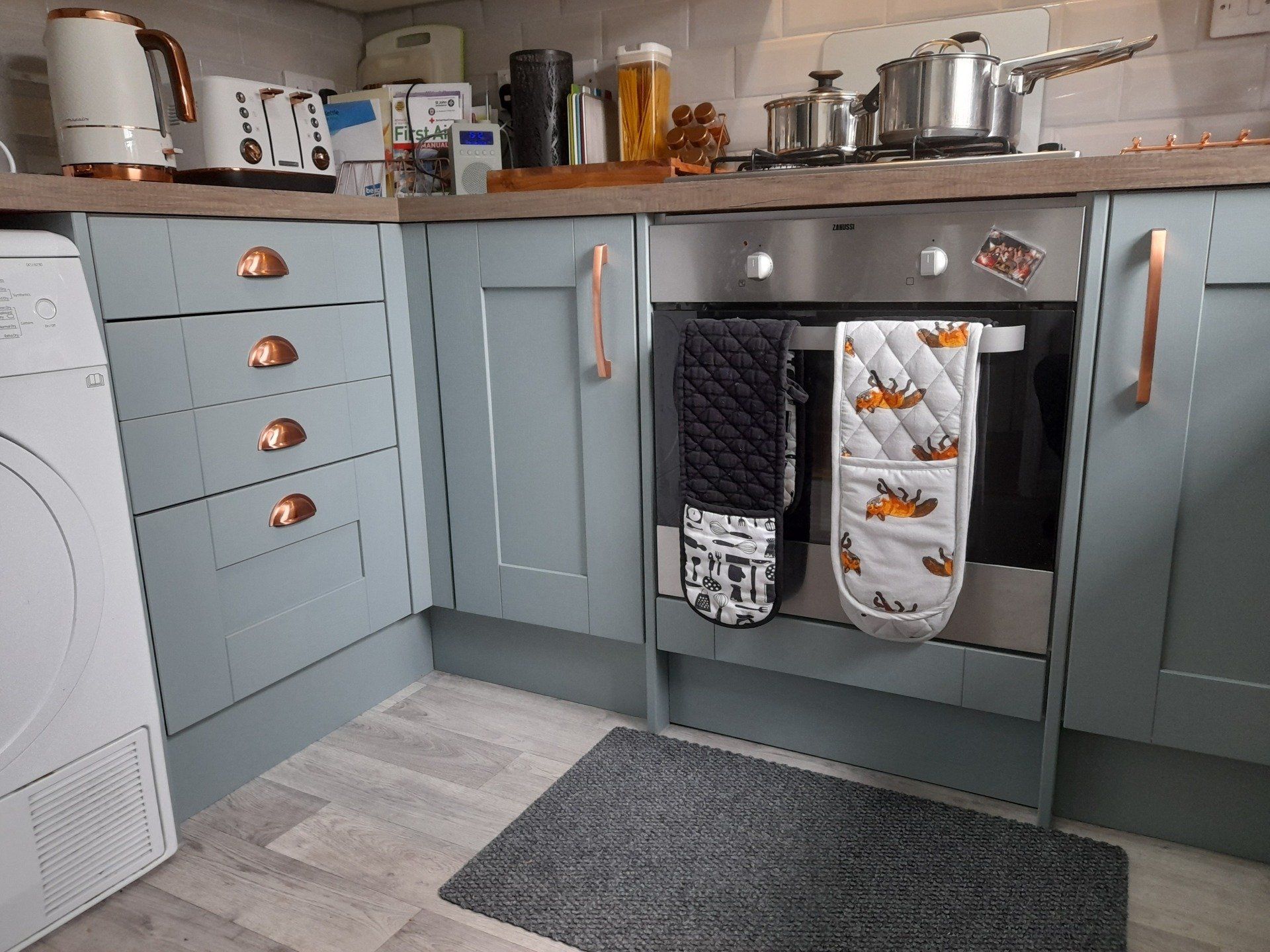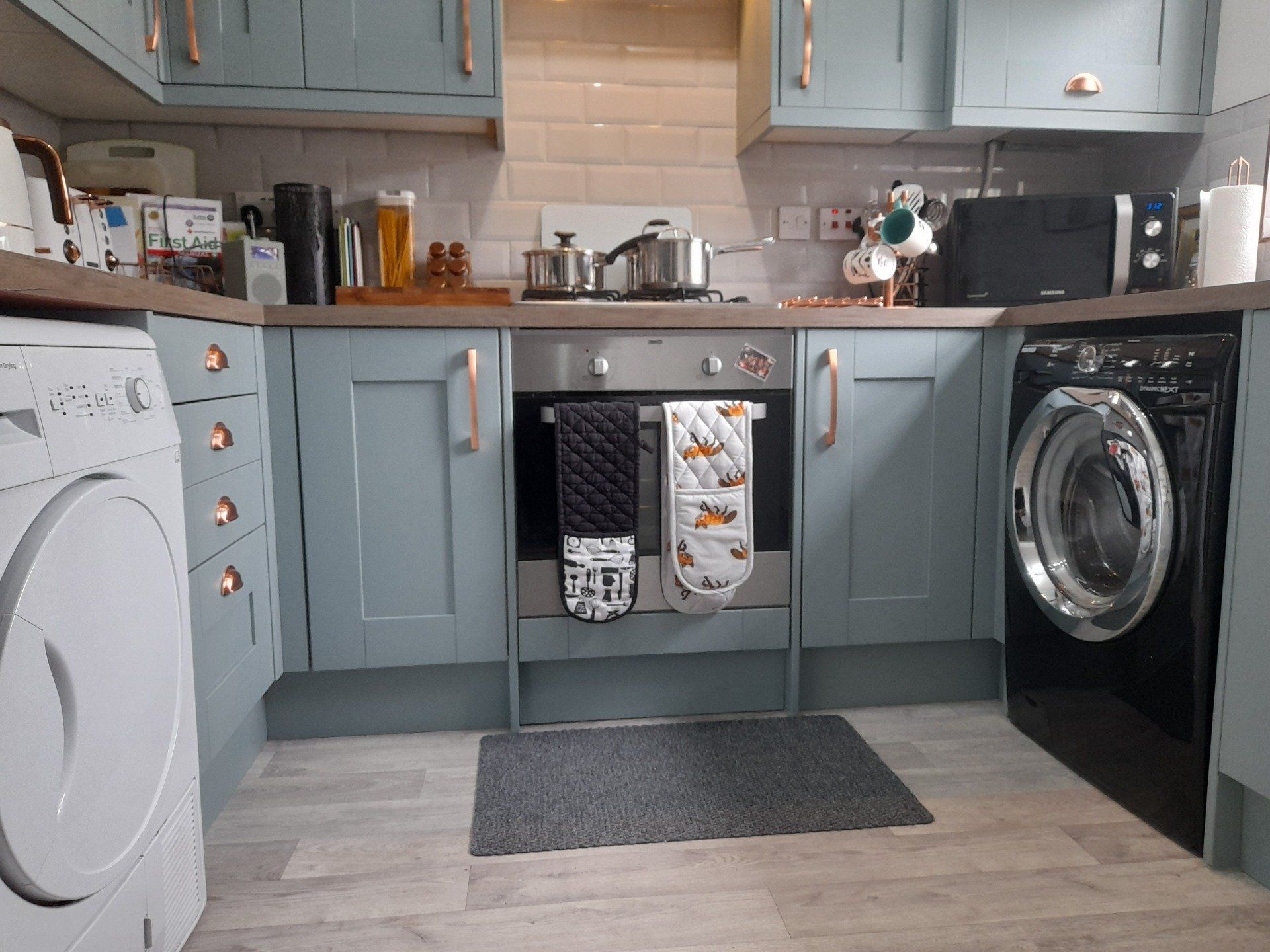 Kitchen was then fitted with laminate worktop, dove grey Metro tiles and wood look lino flooring.