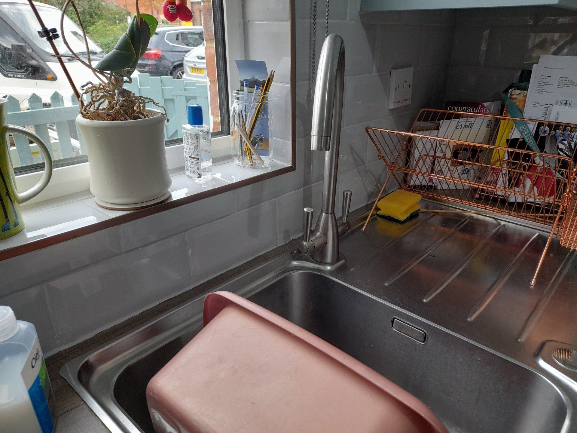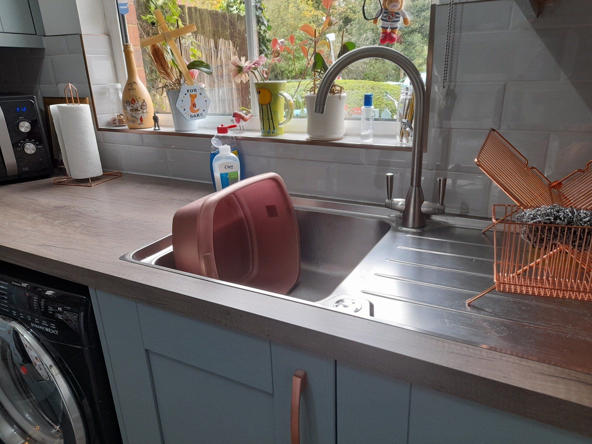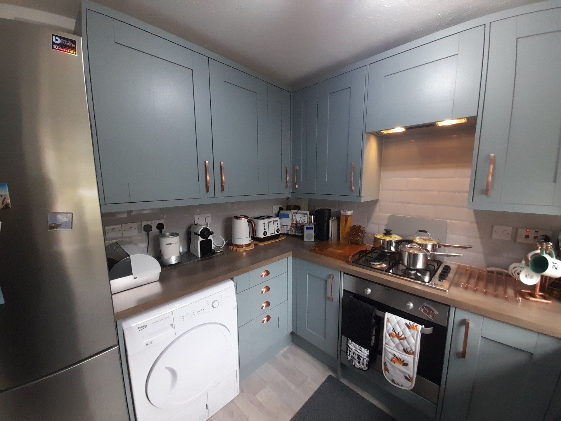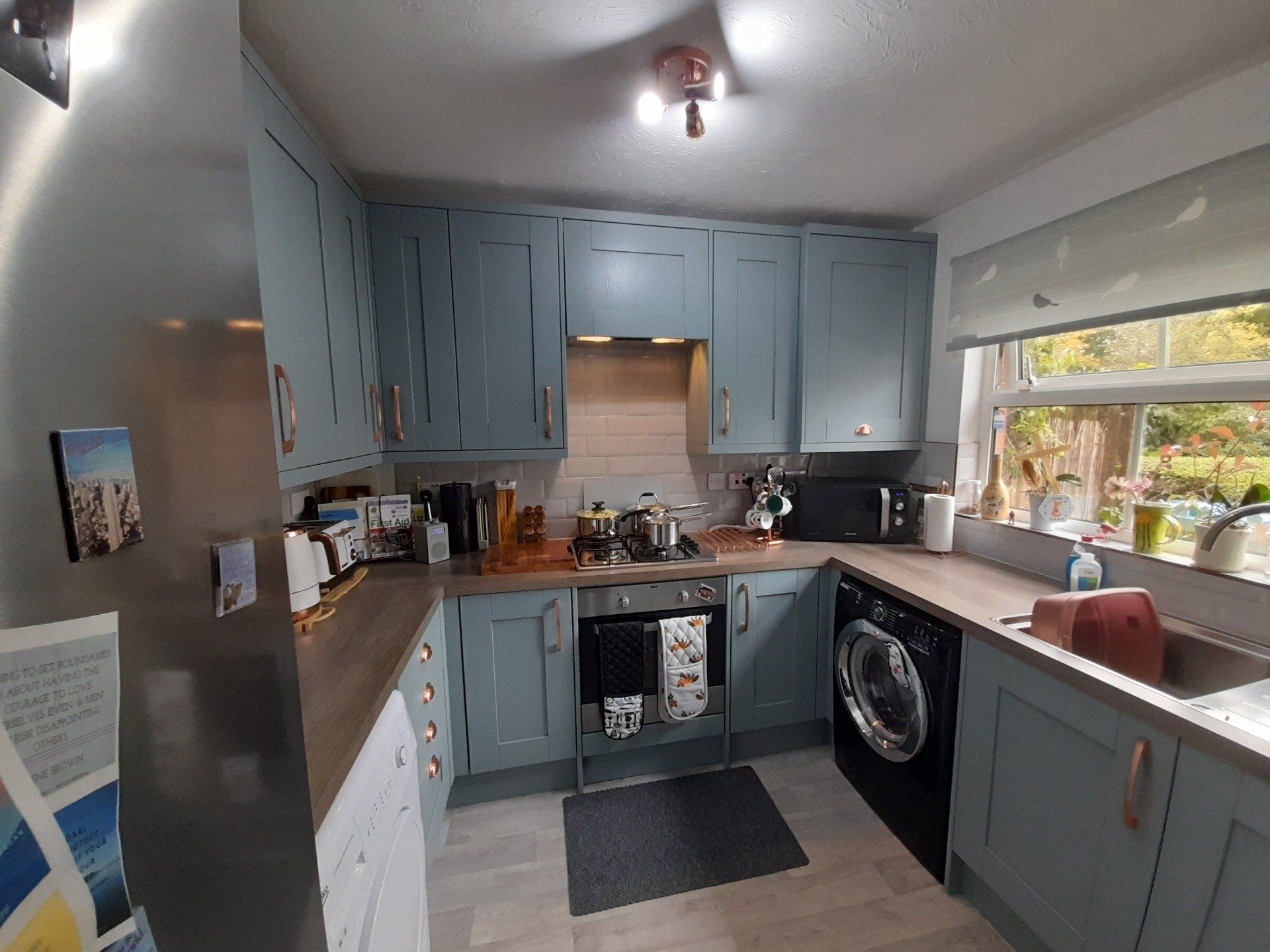 Kitchen was then fitted with laminate worktop, dove grey Metro tiles and wood look lino flooring.