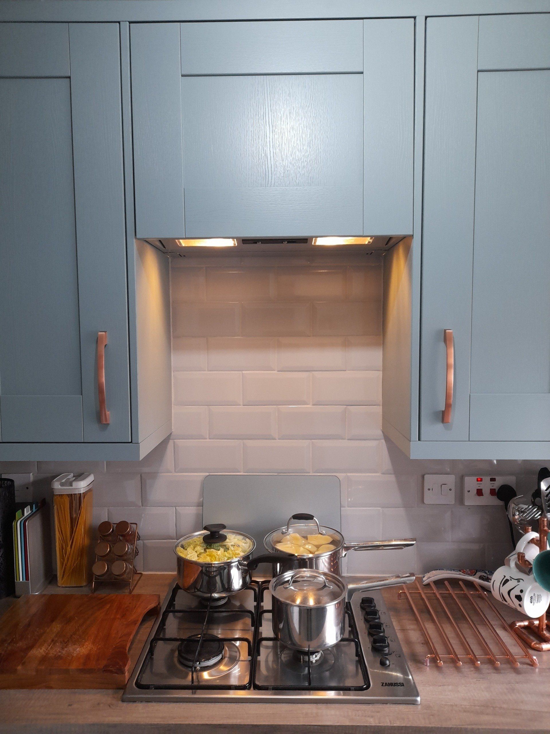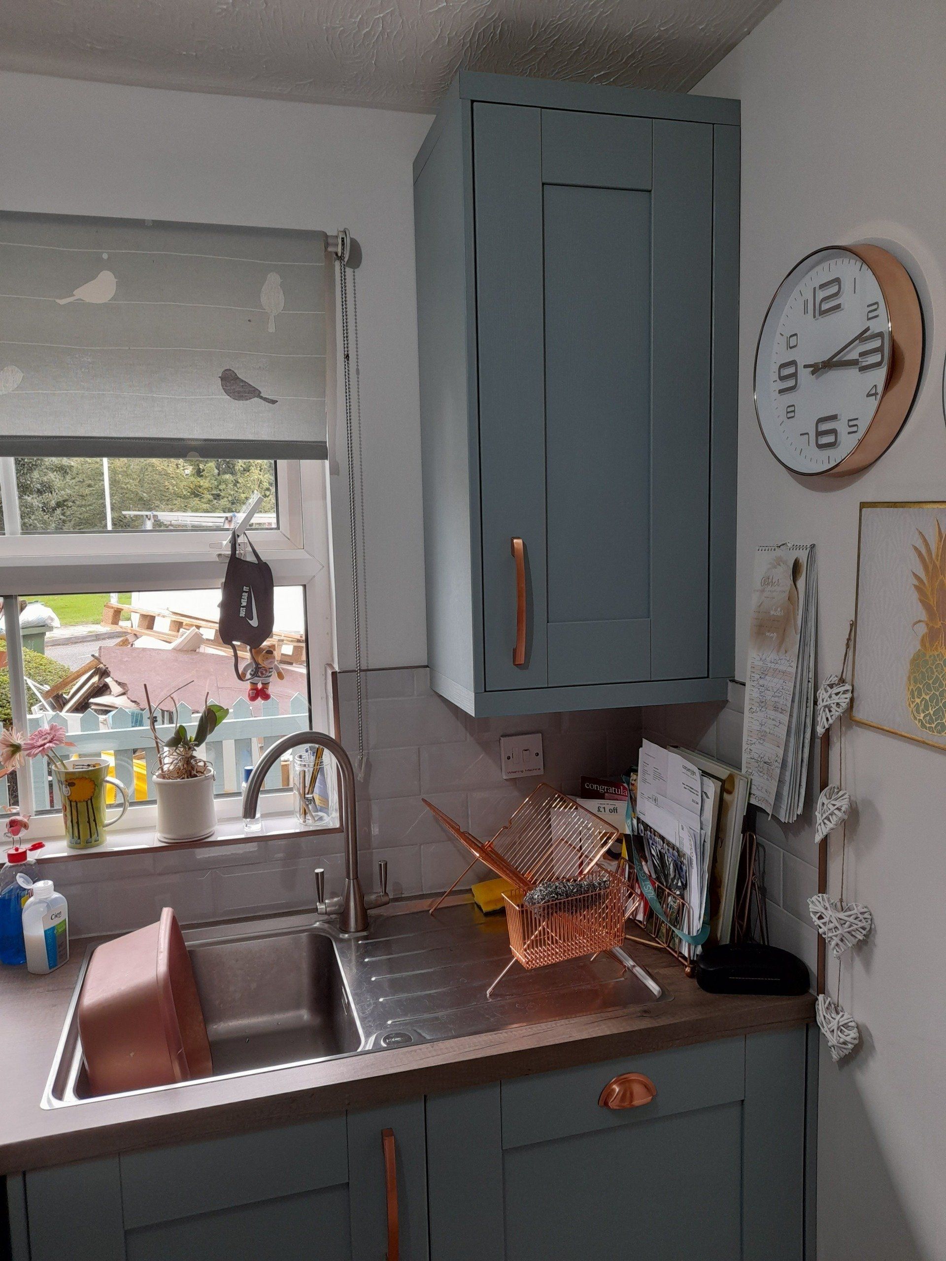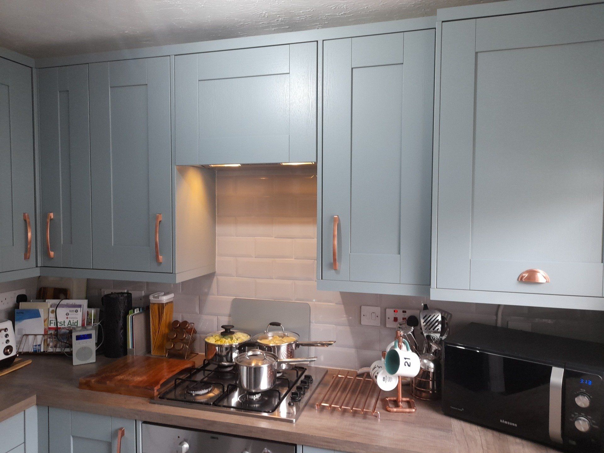 The customer wished to have copper accessories in the kitchen so it was decided that we would substitute the handles from the ones supplied with copper ones and used a copper coloured tile trim to complement them.