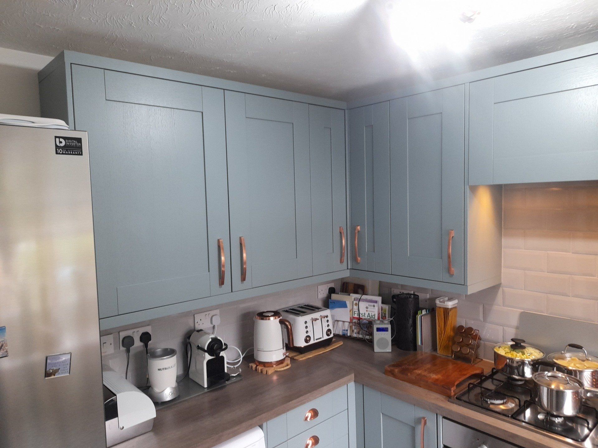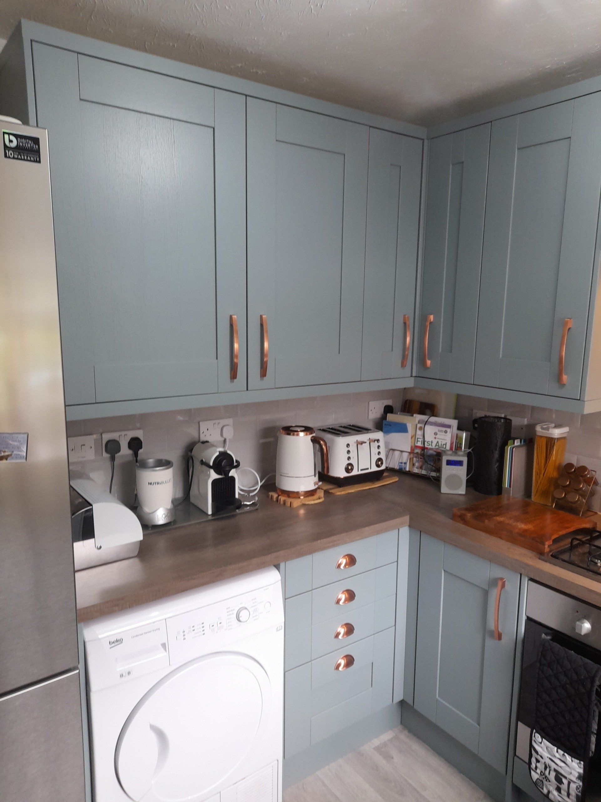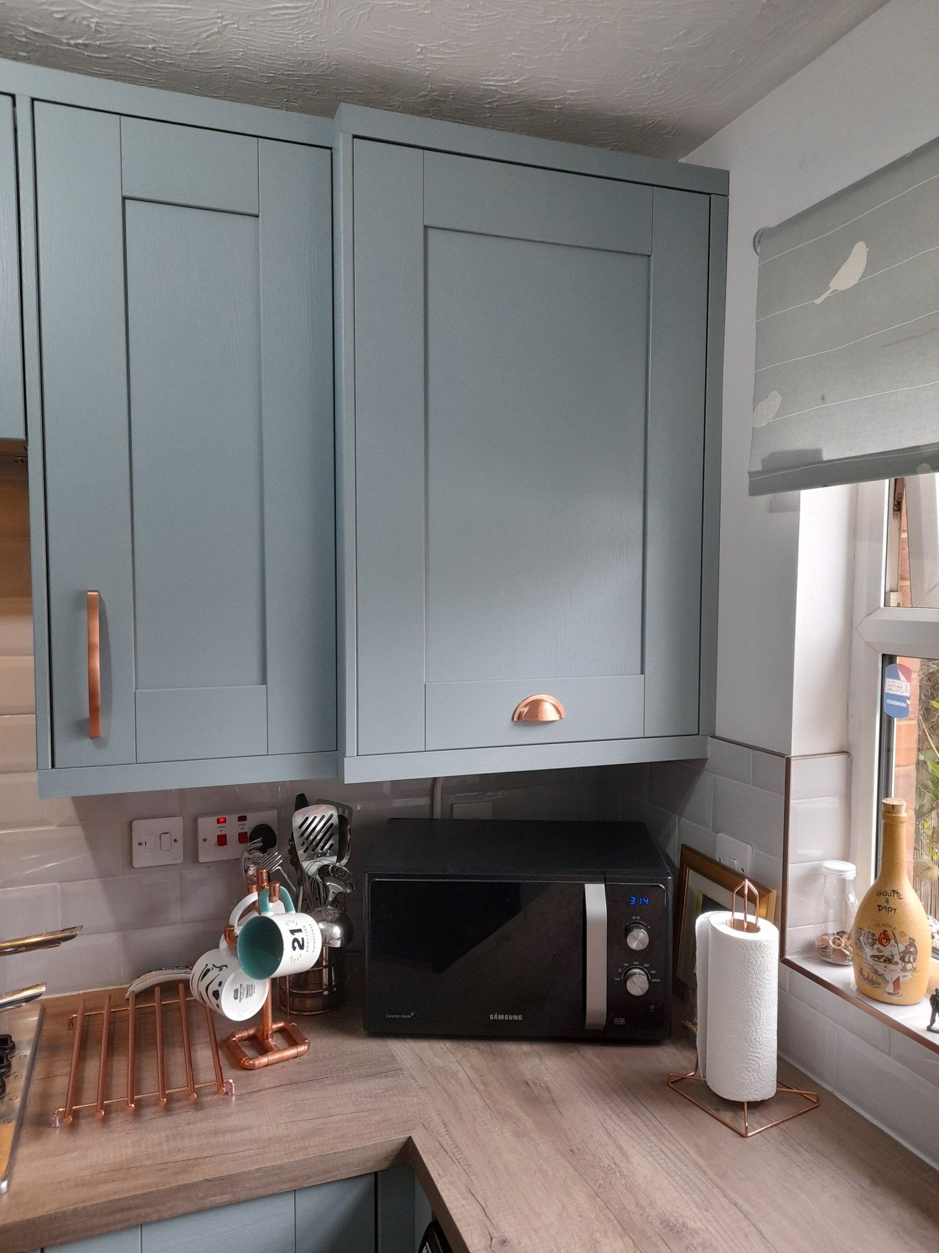 The customer wished to have copper accessories in the kitchen so it was decided that we would substitute the handles from the ones supplied with copper ones and used a copper coloured tile trim to complement them.
