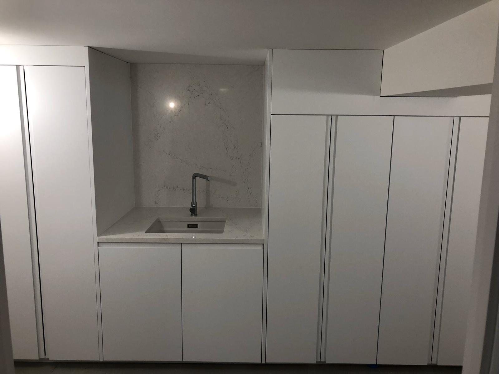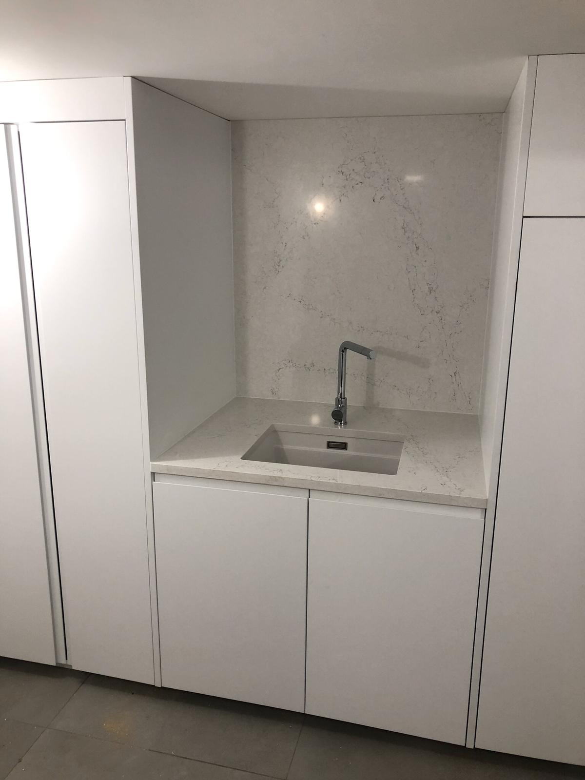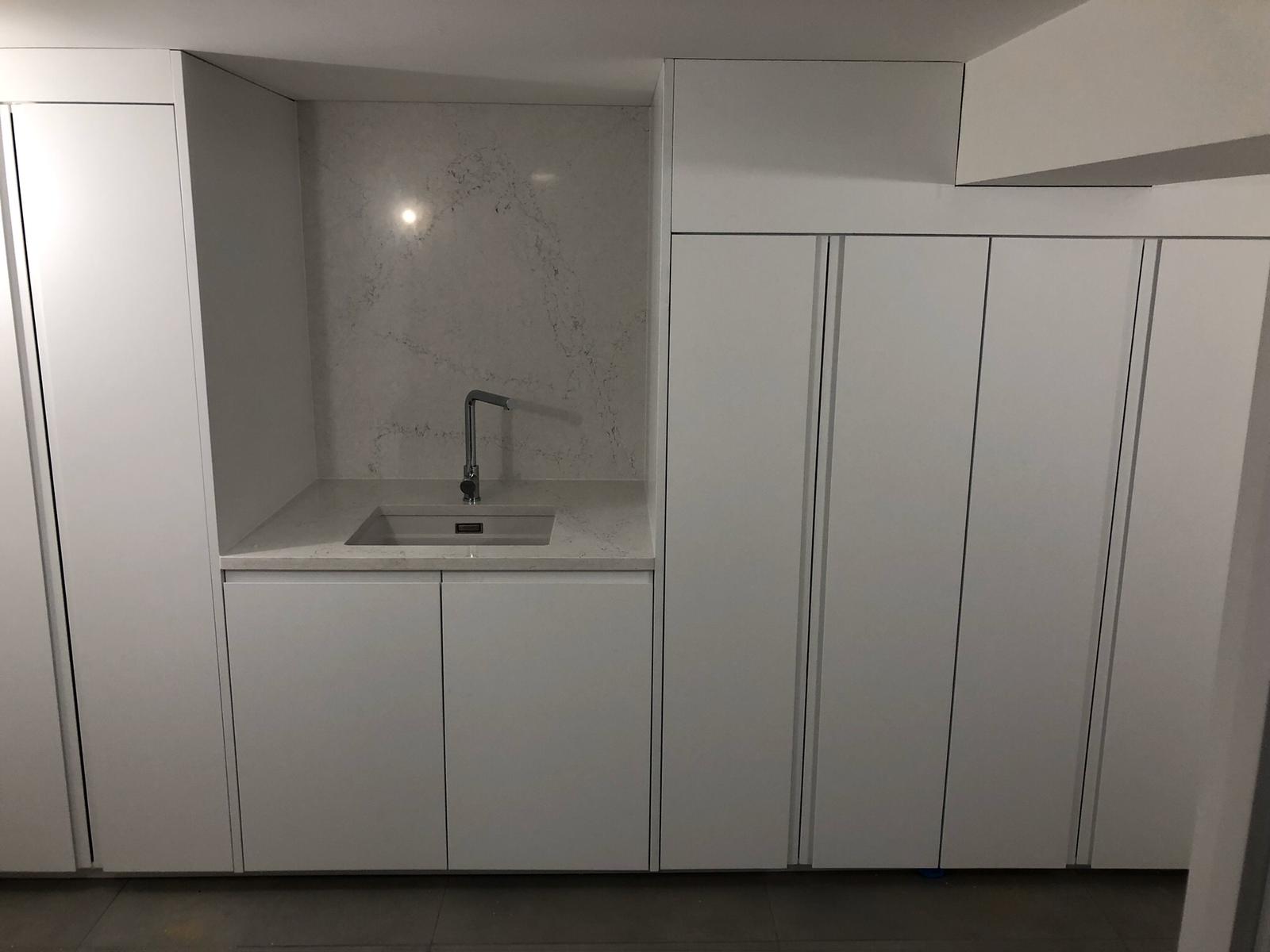 Bespoke English sprayed J handle units with a Silestone worktop and splashback. The mid-height units were designed to hide two free standing appliances (washing machine and tumble drier) with shelving above. The flats 250L Megaflow is hidden by the tall unit. To accommodate the additional weight of these the units have been fitted onto a solid base made onsite.