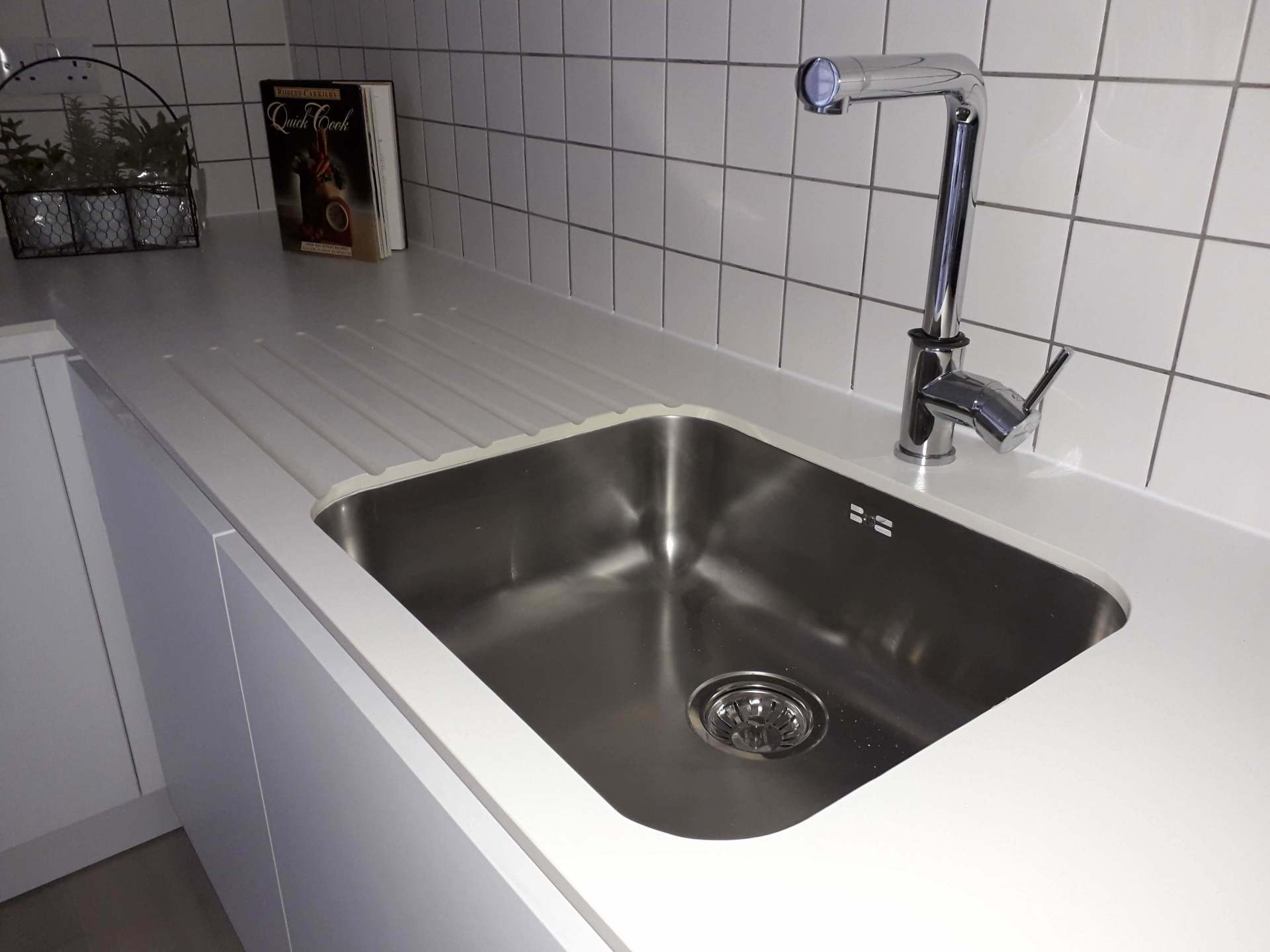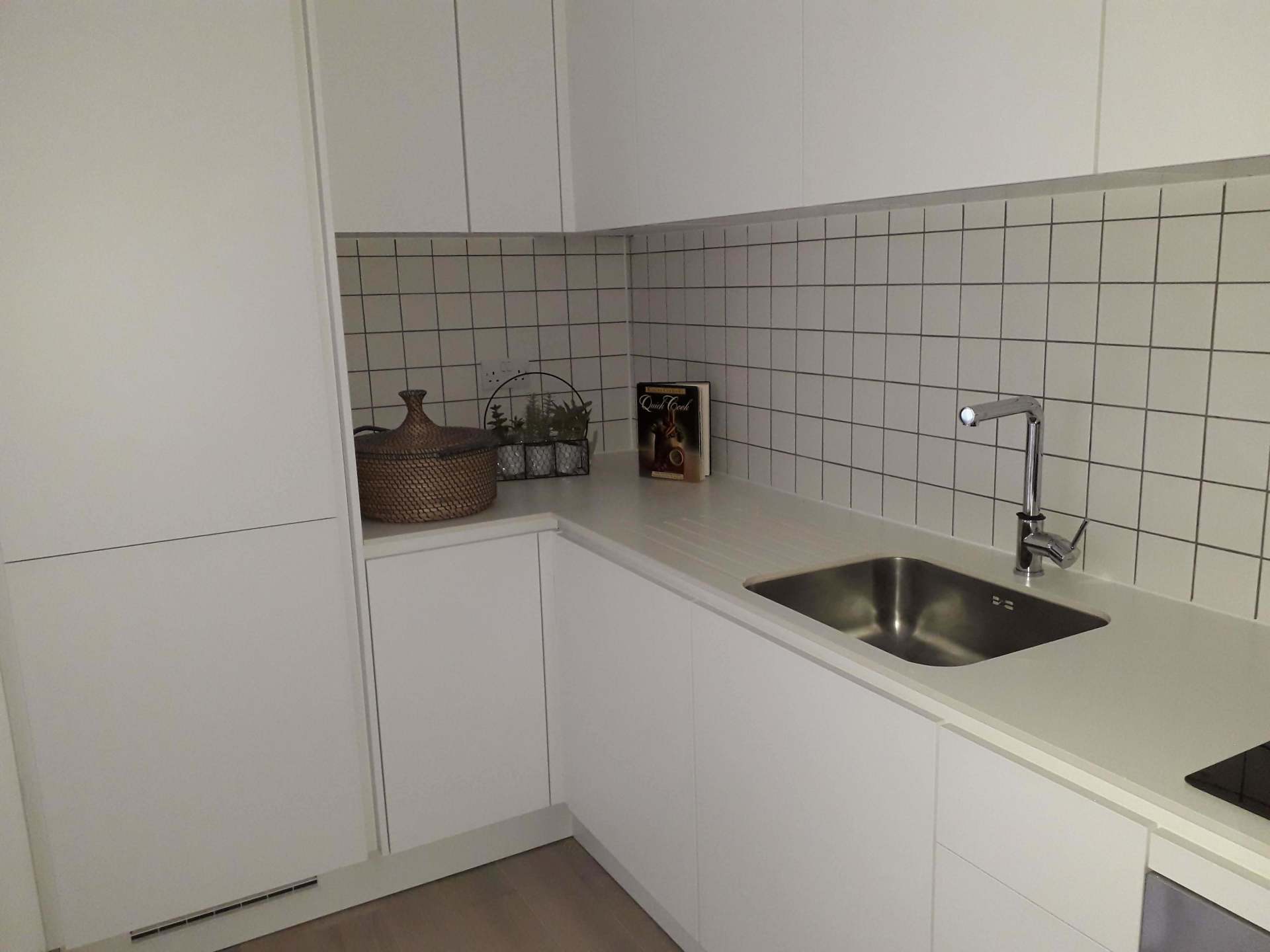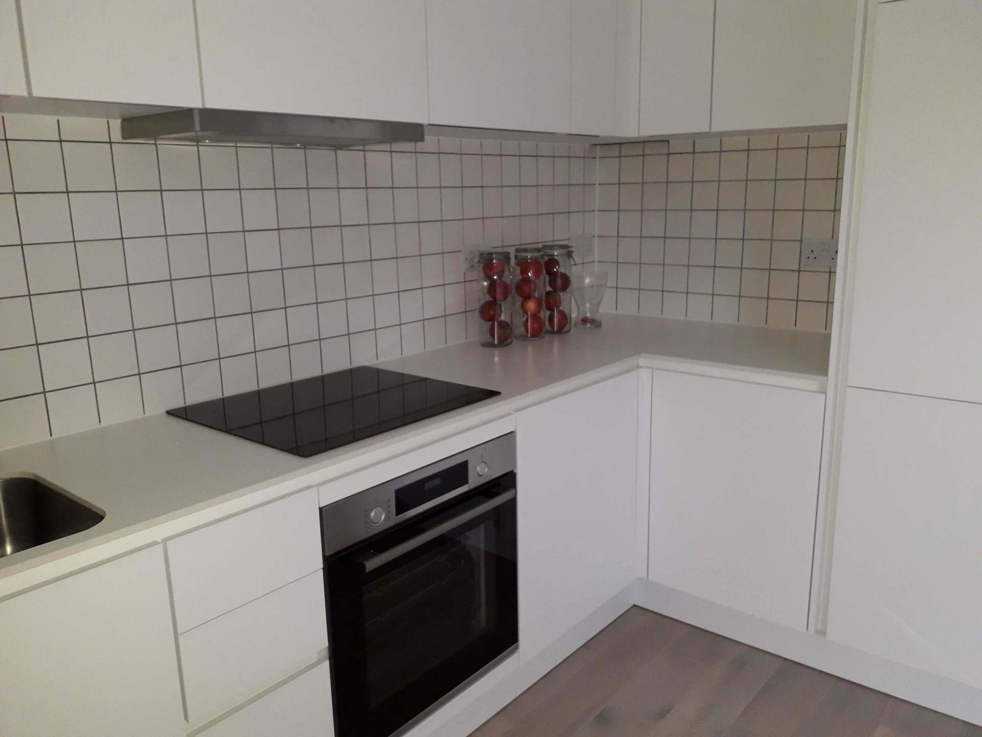 This is one of five identical kitchens which are bespoke German kitchens.It has a solid core laminate worktop which was produced on site. Tiling and floor done by others.